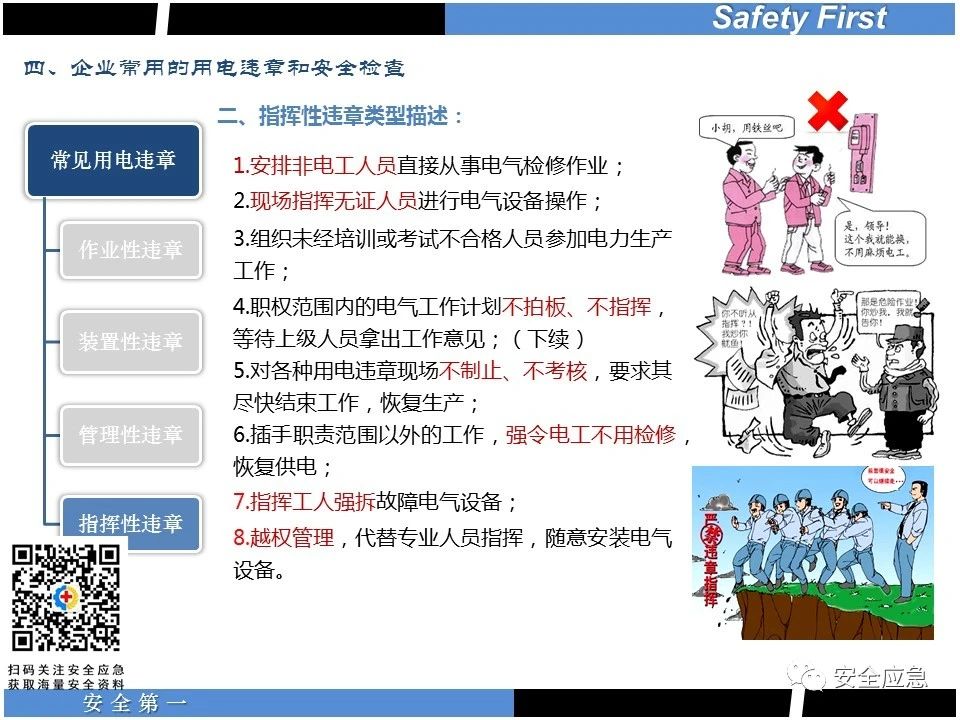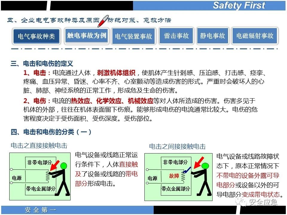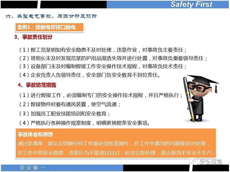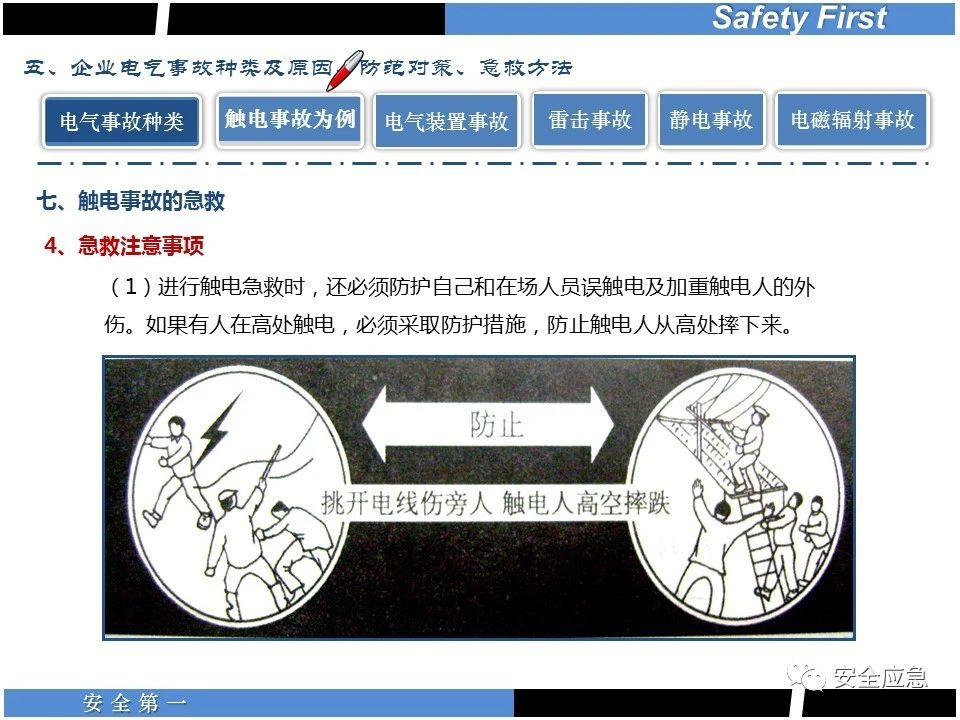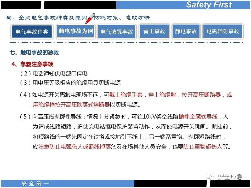 案例73 事故案例73:某35變電站準(zhǔn)備10kV避雷器試驗(yàn)。作業(yè)人員會(huì)同運(yùn)行人員準(zhǔn)備查看設(shè)備實(shí)際情況,拆卸10kV開(kāi)關(guān)柜背板螺栓,打開(kāi)了柜門上的電磁鎖,并打開(kāi)了后柜門后,作業(yè)人員探頭進(jìn)入開(kāi)關(guān)柜內(nèi)時(shí),對(duì)開(kāi)關(guān)柜放電。 其它案例見(jiàn)17、18、19、20、21、22、23、50、52。 (27)多組人員組織混亂 案例74 事故案例74:某單位開(kāi)展500kV線路停電檢修和地線融冰試驗(yàn)。1名工作人員不聽(tīng)他人勸阻,登塔拆除引流線。隨后開(kāi)展地線融冰試驗(yàn),該工作人員觸電死亡。 其它案例見(jiàn)45、46、47、48。 (28)交底不認(rèn)真 案例75 事故案例75:某工作負(fù)責(zé)人帶領(lǐng)兩名工作人員準(zhǔn)備在10kV線路裝設(shè)接地線。工作前,工作負(fù)責(zé)人沒(méi)有進(jìn)行班前(后)會(huì),沒(méi)有分配工作任務(wù),也沒(méi)有交代安全注意事項(xiàng),另外兩人也沒(méi)有主動(dòng)詢問(wèn),相互提醒,導(dǎo)致工作負(fù)責(zé)人無(wú)監(jiān)護(hù)誤登運(yùn)行線路,造成觸電。 其它案例見(jiàn)32。 (29)監(jiān)護(hù)不到位 l 單人工作無(wú)監(jiān)護(hù) 事故案例:36。 l 監(jiān)護(hù)人參與工作 事故案例:11。 l 監(jiān)護(hù)不認(rèn)真,或默許違章行為 事故案例:67。 (30)人員、工作安排不恰當(dāng) 案例76 事故案例76:某供電所安排不具備單獨(dú)工作資格和能力的新入廠員工上桿進(jìn)行配變?cè)O(shè)備搶修工作,由于安全距離不夠,員工經(jīng)驗(yàn)不足,監(jiān)護(hù)不到位,導(dǎo)致觸電。 案例77 事故案例77:某高壓試驗(yàn)班開(kāi)展定檢預(yù)試作業(yè)。工作負(fù)責(zé)人與工作人員在抄錄放電計(jì)數(shù)器銘牌,另一名剛參加工作不久的工作人員拿著自制試驗(yàn)線插入移動(dòng)電源盤插座內(nèi),然后,用左、右手分別拿住兩個(gè)鱷魚夾準(zhǔn)備對(duì)放電器搭接做試驗(yàn),左、右手習(xí)慣性的分別握住了兩個(gè)鱷魚夾的導(dǎo)體部分,此時(shí)電流通過(guò)人體,漏電保護(hù)器沒(méi)有動(dòng)作,觸電死亡。 (31)單人作業(yè) l 野外單人巡線、勘察 案例78 事故案例78:某單位開(kāi)展線路巡視時(shí),單人作業(yè),在被告知“巡視完N58塔后切勿過(guò)江,要沿原路返回”的情況下,仍然獨(dú)自一人違規(guī)游泳過(guò)江,溺水身亡。 案例79 事故案例79:某單位野外勘察時(shí),某工作人員在未告知工作負(fù)責(zé)人的情況下,獨(dú)自一人返回車輛所在地,途中墜落懸崖暈倒,受輕傷并失蹤12小時(shí)。 附件:最全面的電氣安全培訓(xùn),實(shí)用!