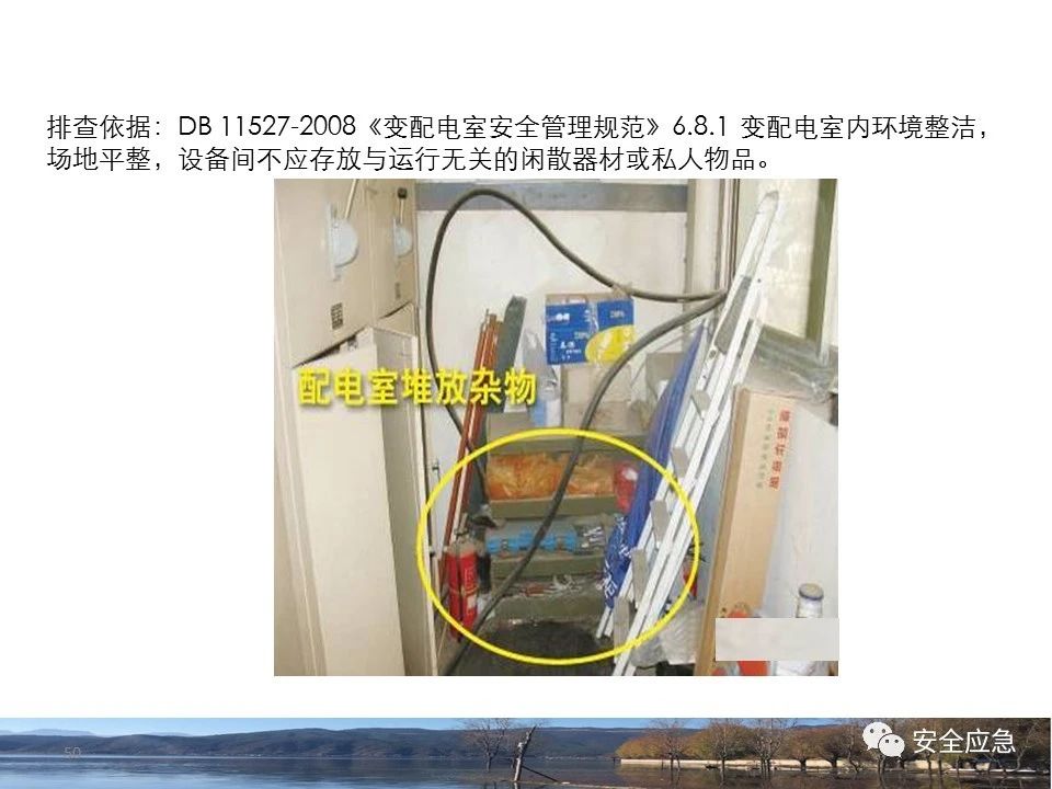 8.1.6規(guī)定配電箱、開(kāi)關(guān)箱周圍應(yīng)有足夠2人同時(shí)工作的空間和通道,不得堆放任何妨礙操作、維修的物品,不得有灌木、雜草。