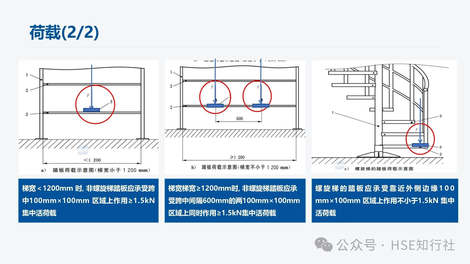 1、梯寬<1200mm 時, 非螺旋梯踏板應承受跨中100mm×100mm 區域上作用≥1.5kN集中活荷載