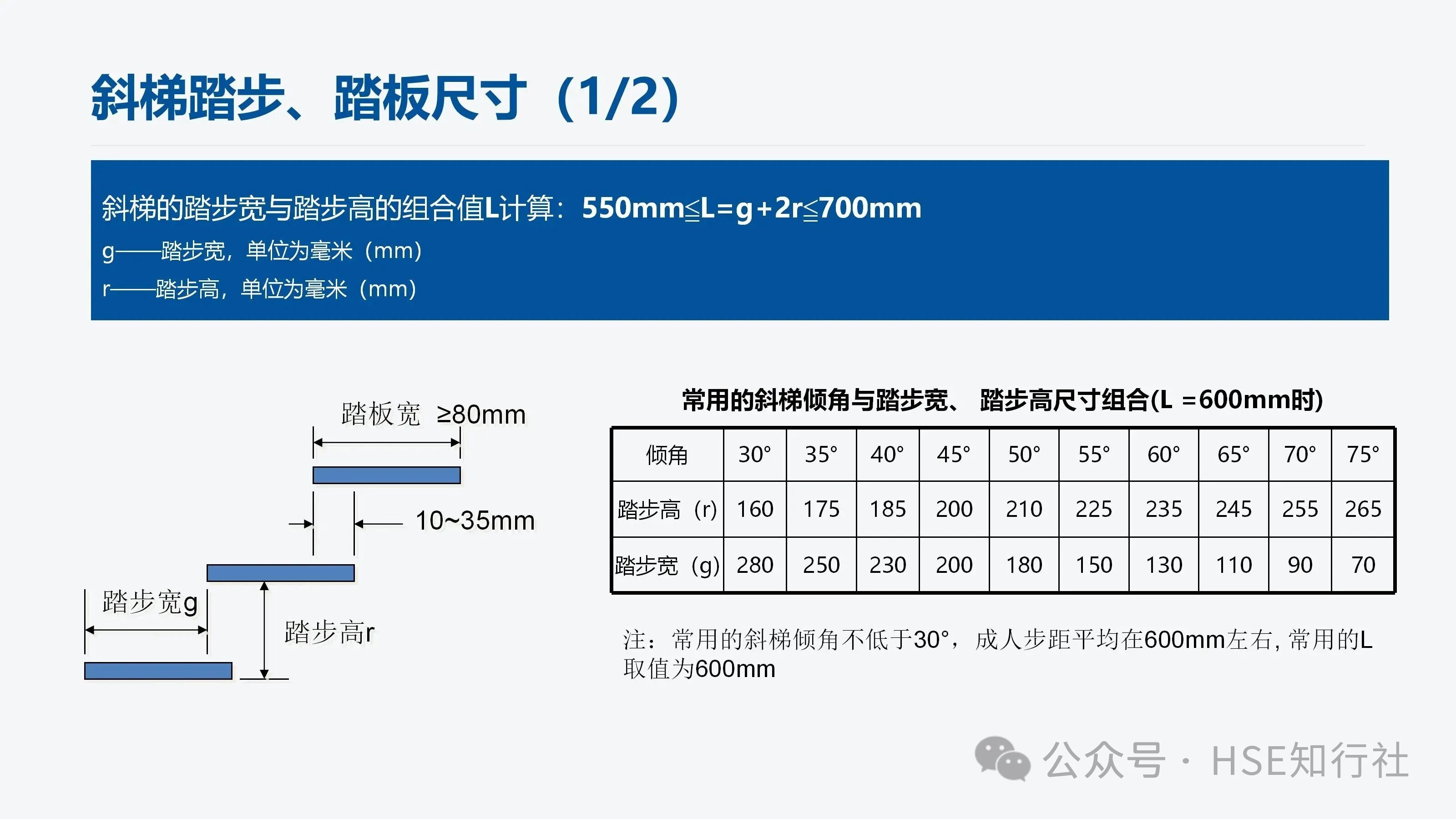注:常用的斜梯傾角不低于30°,成人步距平均在600mm左右, 常用的L取值為600mm。