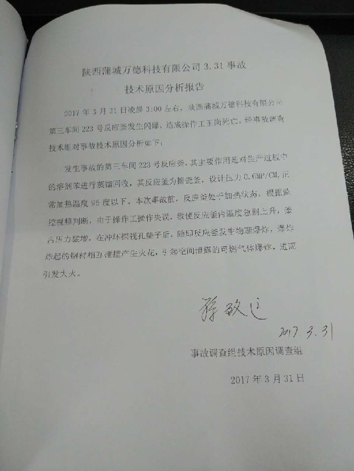 2017年3月31日凌晨3:00左右,蒲城萬德科技有限公司第三車間223反應釜發生閃爆,引發第三車間著火,造成一起1名夜班工人死亡。事故發生后,該公司值班領導向公司領導進行了報告,該公司立即啟動了《生產安全事故應急救援預案》,組織工人啟動消防水泵進行現場救援,組織廠區其他工人撤出生產廠區,同時向110、119、120請求救援,向相關政府部門進行了報告。接到報告后,縣公安局陳莊派出所、安監局、蒲城高新區管委會、消防大隊、120急救部門第一時間趕到現場進行救援處置,凌晨4時20分左右成功撲滅事故現場明火。隨后該公司組織在第三車間二樓平臺找到王崗的尸體,證實該名工人在爆炸中當場死亡。