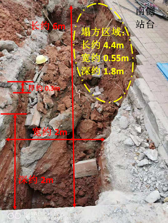 溝槽南側(cè)惠豐城公交站臺鋪磚區(qū)下方基坑側(cè)壁有坍塌現(xiàn)象,塌方長度約為4.4m,寬度約0.55m,深度約1.8m,溝槽北側(cè)龍海二路硬化路面處完好。(見圖二)