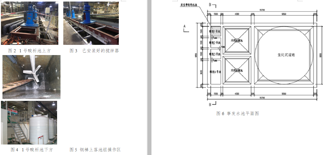 截至2019年5月14日,三期項目整體工程進度已完成70%左右,其中排放系統(廢水處理系統)已完成45~50%。事故發生前,1、2、3、4號酸析池上方均已安裝好攪拌器,攪拌器采用角鋼及鐵架固定,未放水進行調試。(現場情況見圖2-5)
