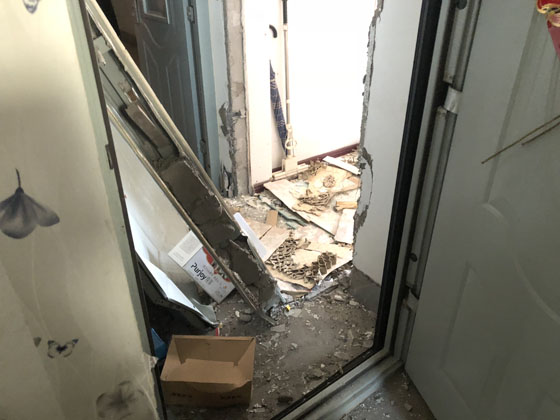 葉蘭的家住在小清河南路附近某小區(qū)六樓,和鄰居家在角落里兩側,兩家的門不過一米左右的距離。此時他們不知道的是,鄰居家的門已被一股巨大的沖擊波頂開,整個門甚至連門框都被炸了下來,歪倒在墻面上。
