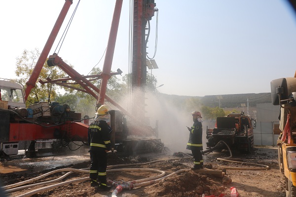 蘭州支隊七里河消防大隊第一時間到達現(xiàn)場參與處置,到達現(xiàn)場后發(fā)現(xiàn):現(xiàn)場管道仍處于天然氣泄漏狀態(tài),未有明火發(fā)生。現(xiàn)場指戰(zhàn)員立即設(shè)置警戒線,對現(xiàn)場圍觀施工人員及群眾進行疏散撤離,對泄露事故點毗鄰居民樓進行人員通告疏散,同時設(shè)置水槍防護陣地。隨著增援中隊處置力量的到達,現(xiàn)場處置指揮員七里河大隊大隊長,統(tǒng)一指揮調(diào)度現(xiàn)場事故處置力量:首先,結(jié)合現(xiàn)場街道路況,設(shè)置疏散組,對毗鄰居民樓全面進行人員清查疏散。設(shè)置警戒組并專人看守,嚴防非事故處置人員進入。然后在先期到達成立的消防水槍防護陣地基礎(chǔ)上,增設(shè)水槍防護陣地;其次調(diào)派到達現(xiàn)場的增援消防中隊兩臺水罐消防車全程待命,做好供水保障。