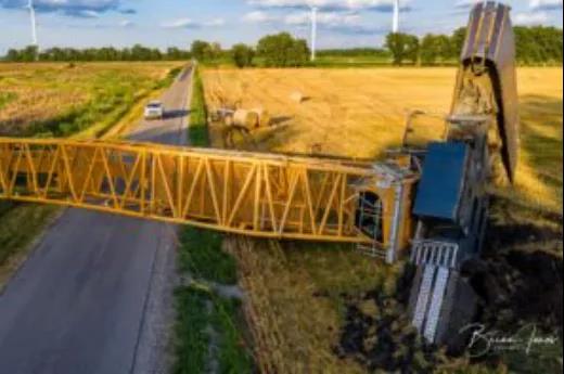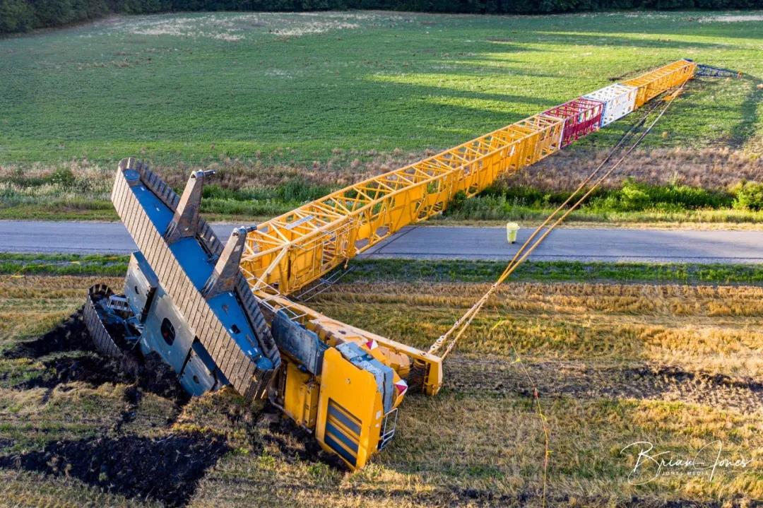 該風電場項目準備安裝 61 臺渦輪機,最大發(fā)電量為 219.6 兆瓦。該項目將覆蓋約 50,000 英畝土地。事故吊車屬于當?shù)匾患绎L能和太陽能公司,當時這輛800t履帶吊車正用于安裝風電機組,該風電機組通常位于雅芳北部和特里普西南部。當時疑似下方地面松軟,未進行吊裝前的勘察工作,負載過高造成大規(guī)模下陷,從而導致整車側(cè)翻。