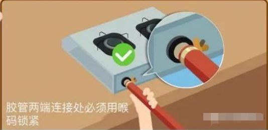 請使用專用燃氣膠管,長度不超過2米、使用時間不得超過兩年、無老化破損的情況。膠管與氣瓶減壓閥、灶具、熱水器的接口處必須加裝管箍鎖緊,防止因膠管松動出現煤氣泄漏。