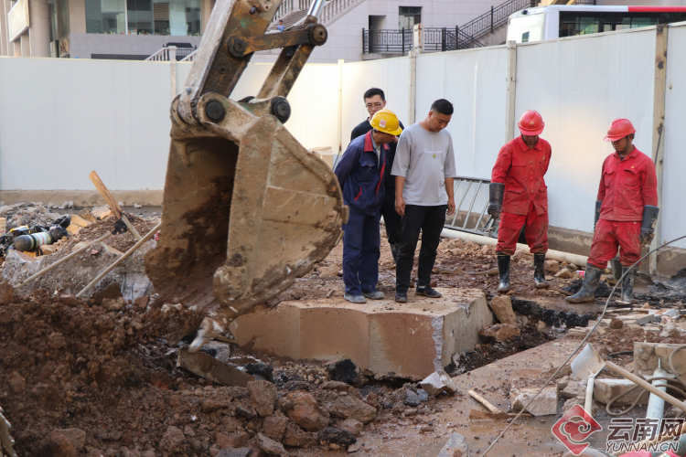 記者在現場看到,中鐵十八局、燃氣公司、消防單位、交警單位、軌道公司等工作人員正在事發區域進行搶修,一輛消防車停靠在施工圍擋墻外,一輛標有昆明煤氣的搶修車輛及兩輛標有云南中石油昆侖燃氣的燃氣搶險車輛停在施工區域內,另有一臺挖掘機正在作業,一旁的交通信號燈已經熄滅,交警在交叉口指揮疏導通行車輛。