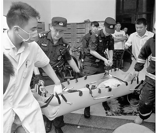 情況危急,消防隊員與PTU隊員合力將受傷男子抬上擔架,由120急救車送往醫院救治。