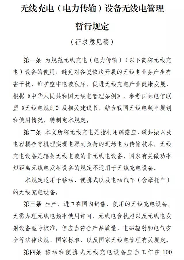 《無線充電(電力傳輸)設備無線電管理暫行規定》公開征求意見